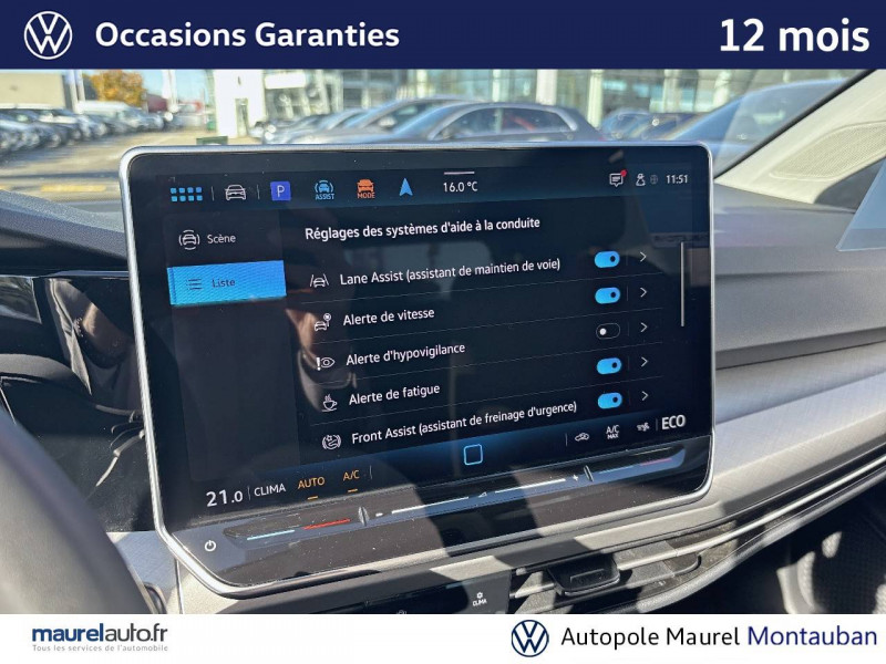 2 interfaces usb-c à l'av / 2 lampes de lecture à l'av et à l'ar / 2 prises de chargement usb-c derrière l'accoudoir pour les passagers ar / accoudoir central ar rabattable avec 2 portes-boissons / accoudoir central av réglable en hauteur et en profondeur avec compartiment de rangement / activation automatique du signal de détresse en cas de freinage d'urgence / airbags de tête pour passagers av/ar / airbags frontaux av conducteur et passager (airbag passager désactivable) / app-connect sans fil affichage et contrôle via l'écran tactile du véhicule, du contenu, des fonctions et des applications compatibles présents sur le smartphone (compatibilité avec les systèmes apple carplay et android auto) / application décorative "nature cross brushed" pour tableau de bord et les revêtements de portes av / appuis lombaires réglables à l'av / assistant de changement de voie avec détecteurs d'angle mort 'side assist' / avertisseur sonore et lumineux pour ceintures non attachées av/ar / câble adaptateur usb-c vers usb-a / cache-bagages amovible / caméra de recul "rear view" caméra de recul avec visualisation de la zone située ar du véhicule sur l'écran de la radio ou de la radionavigation / ceintures de sécurité automatiques av 3 points à enrouleur, réglables en hauteur, avec prétentionneurs / cerclage chromé des commandes des vitres, de réglage des rétroviseurs et des aérateurs / climatisation "air care climatronic" 3 zones et filtre anti-allergène et éléments de commandes à l'ar / commande vocale (ida) avec amplificateur de voix électronique / correcteur électronique de trajectoire esp, amplificateur de freinage d'urgence, antiblocage des roues abs, blocage électronique de différentiel eds, répartiteur électronique de freinage ebv, antipatinage électronique asr, régulateur électronique de couple msr et assistance au contrebraquage / digital cockpit pro : combiné d'instruments digital avec écran digital haute résolution de 10,25" / ecall : appel d'urgence manuel ou automatique / eclairage à led de la plaque d'immatriculation ar / eclairage d'ambiance 10 couleurs / eclairage d'ambiance extérieur poignées de portes éclairées et éclairage périmétrique avec projection du logo / ecrous antivol / essuie-glace ar intermittent avec lave-glace / fatigue détection : système de détection de fatigue du conducteur qui analyse le comportement du conducteur et recommande un temps de repos par l'apparition d'un message visuel et sonore / feu ar de brouillard d'un côté, feux de recul des deux côtés / frein de stationnement électromécanique avec fonction d'immobilisation en pente "auto hold" et assistant de démarrage en côte / front assist - système de surveillance périmétrique avec fonctions de freinage d'urgence en ville et détection des piétons / indicateur de température extérieure avec avertisseur de gel / interface téléphone bluetooth / jantes en alliage léger 17" 'nottingham' avec pneumatiques 225/45 r17 94w xl à résistance au roulement optimisée / kit de dépannage : compresseur 12 v et produit d'étanchéité de pneu / lane assist: assistant de maintien dans la voie / mesures de protection des piétons supplémentaires / miroirs de courtoisie éclairés dans les pare-soleils / oeillets d'arrimage isofix (dispositif pour fixation de 2 sièges-enfants sur la banquette ar) / pack confort avec park assist pro - système de verrouillage et de démarrage sans clé?keyless access' avec safelock, - alarme antivol - assistant aux manoeuvres de stationnement ?park assist pro' - techologie car2x / pack 'eclairage & visibilité' - régulation automatique des feux 'light assist' / pack visibilité - allumage automatique des feux avec fonctions "coming home" et "leaving home" - capteur de pluie avec essuie-glace automatique / pare-chocs, boîtiers de rétroviseurs extérieurs et poignées de portes dans la couleur carrosserie / park pilot : système d'aide au stationnement av/ar avec signaux sonores et visualisation de la distance des obstacles sur l'écran / peinture unie / pommeau du levier de vitesse cuir / préparation pour "vw connect" et "vw connect plus" / prise 12 v dans le coffre / projecteurs 100% led (projecteurs, feux de jour av, feux ar) / réglage du site des phares / régulateur de vitesse adaptatif et prédictif acc avec limiteur de vitesse détecte dans les limites du système et à l'aide d'un capteur radar les véhicules qui précèdent et maintient la distance en intervenant sur les freins et l'accélérateur (régulation active, de 0 à 210 km/h ; jusqu'à l'arrêt du véhicule). le conducteur peut calibrer la distance souhaitée par rapport aux autres automobilistes / rétroviseur intérieur à réglage jour/nuit automatique / rétroviseurs extérieurs à réglage, rabattement et dégivrage électriques, avec fonction mémoire / revêtement de porte et latéral en feuille de mousse et tissu / sellerie en tissu "maze" / service d'appel d'urgence (inclus 10 ans et disponible indépendamment de l'inscription dans le système d'infotainment) / sign assist: reconnaissance des panneaux de signalisation et affichage sur le 'digital cockpit' et l'écran du système de radionavigation / système de freinage anti multicollision: ce dispositif freine automatiquement le véhicule après un premier choc afin de limiter le risque de multicollision / système de navigation & infotainment "discover" avec "services de streaming et radio via internet" via carte esim intégrée, radio 7 hp et écran couleur tactile 12,9" avec projection de la cartographie dans l'écran du "digital cockpit pro" / système start/stop avec dispositif de récupération de l'énergie au freinage / tapis de sol av/ar / verrouillage centralisé avec télécommande à fréquence radio par clé rétractable / xds : système agissant comme un différentiel autobloquant électronique permettant une meilleure motricité en courbe grâce à une répartition optimale 